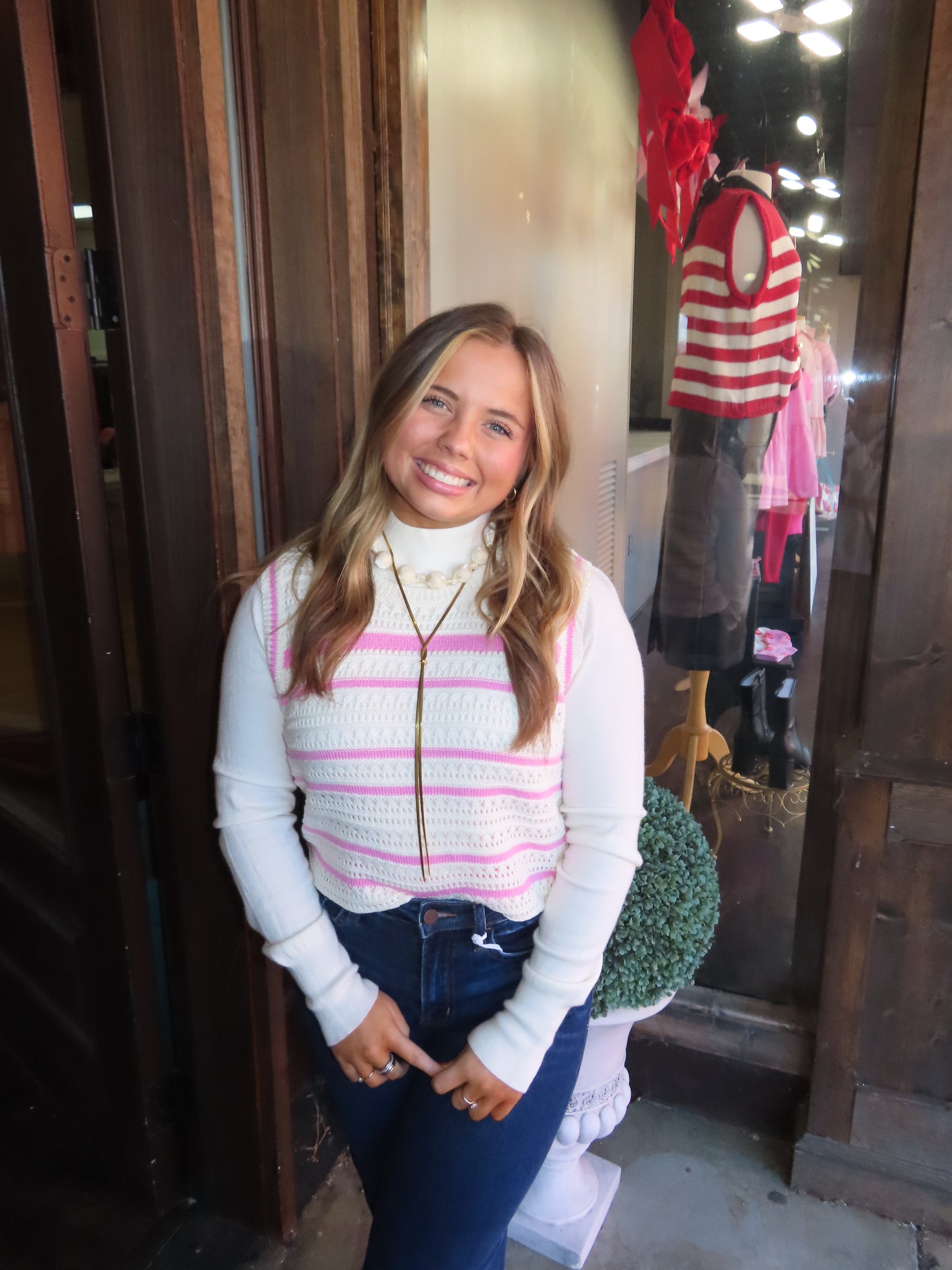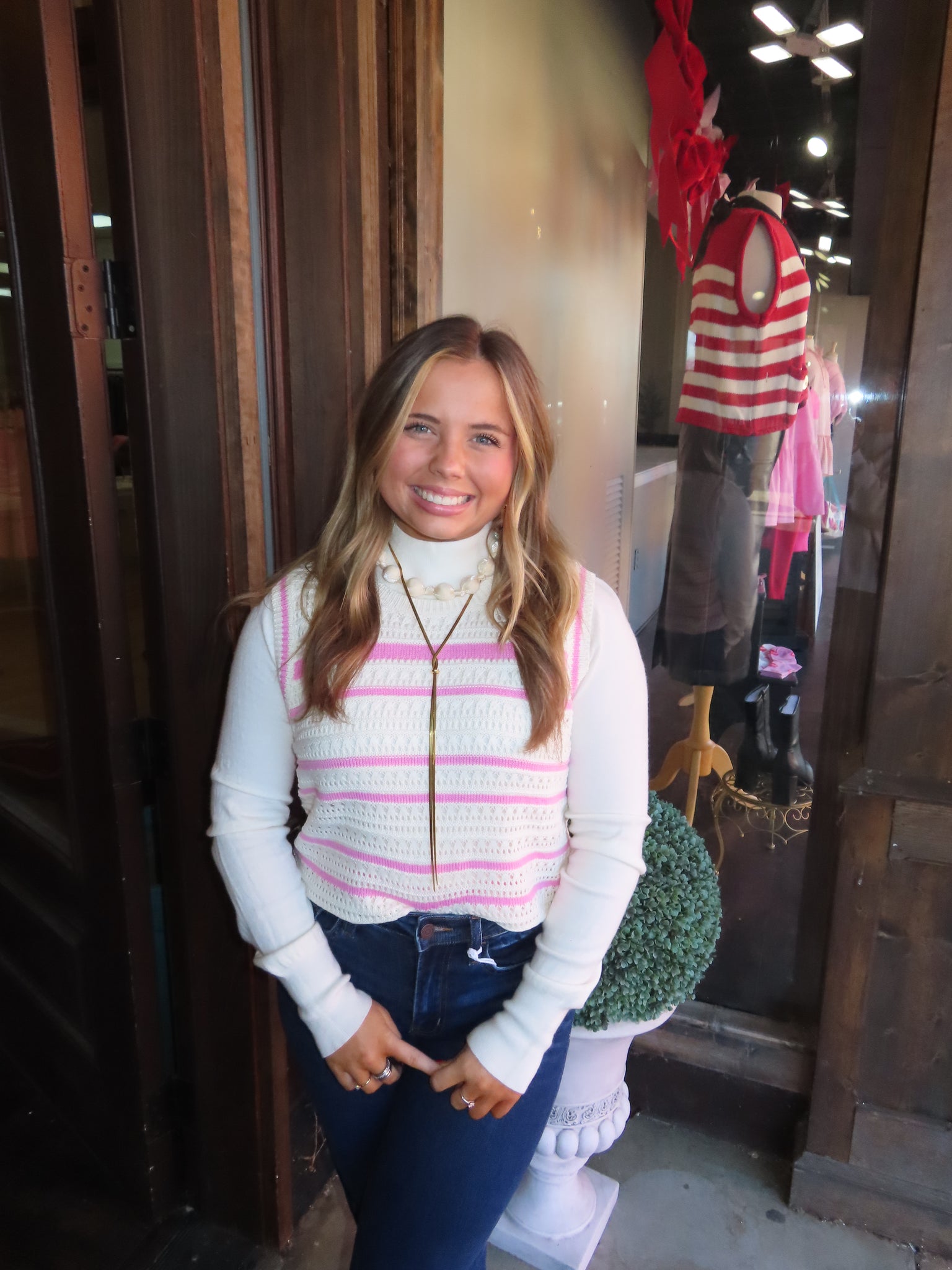 Cozy up in this charming cream knit adorned with delicate pink stripes that add just the right pop of color. 🩷 Perfect for layering or wearing solo, this playful top brings a touch of sweetness to your everyday wardrobe. The soft, breathable knit fabric keeps you comfortable all day long, whether you're running errands or catching up with friends. A versatile piece that pairs effortlessly with your favorite jeans, skirts, or trousers for endless styling possibilities.