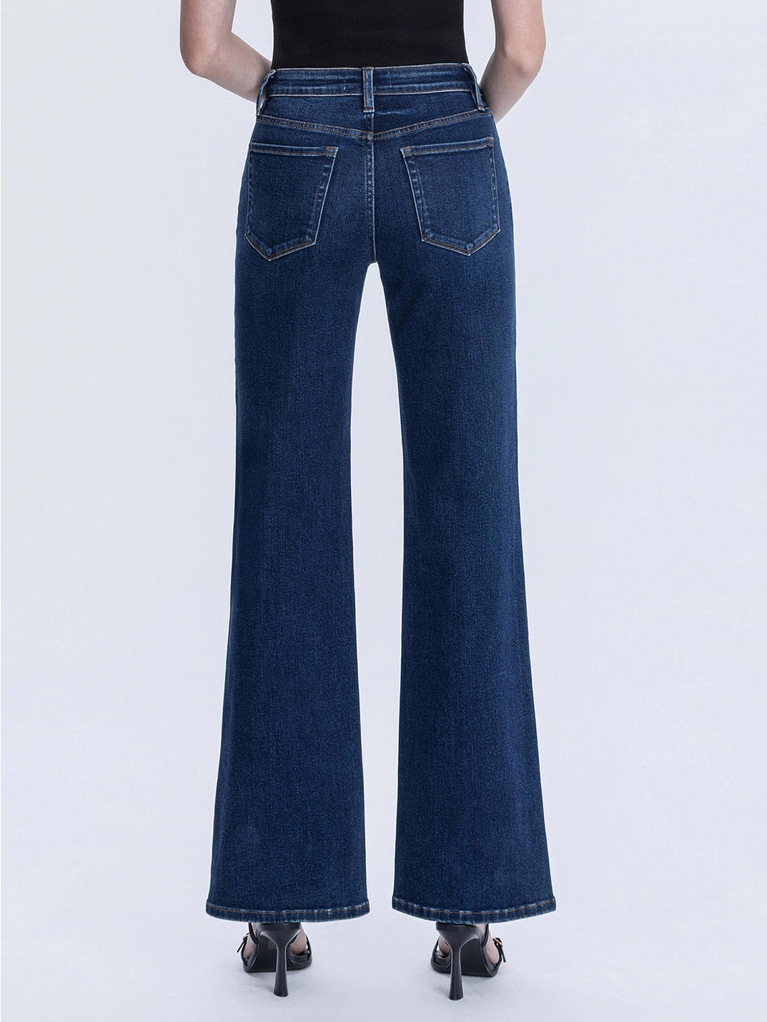 Crafted from comfortable stretch denim, these jeans feature a flattering high-rise waist, classic five-pocket styling, a finished hem, and a full-length vintage flare silhouette.