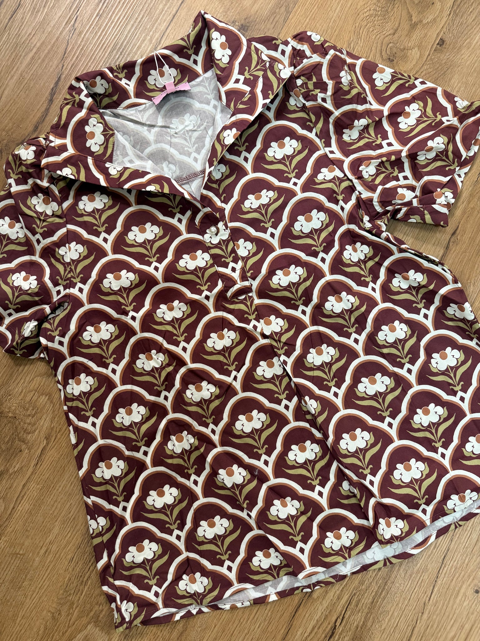 Add a splash of vintage charm to your wardrobe with the Retro Bloom Blouse. Featuring a cheerful green and white floral print against a warm light brown background, this top brings a fun, garden-fresh vibe to any outfit. Its playful pattern and comfortable fit make it perfect for sunny days and casual outings, letting your style blossom wherever you go.